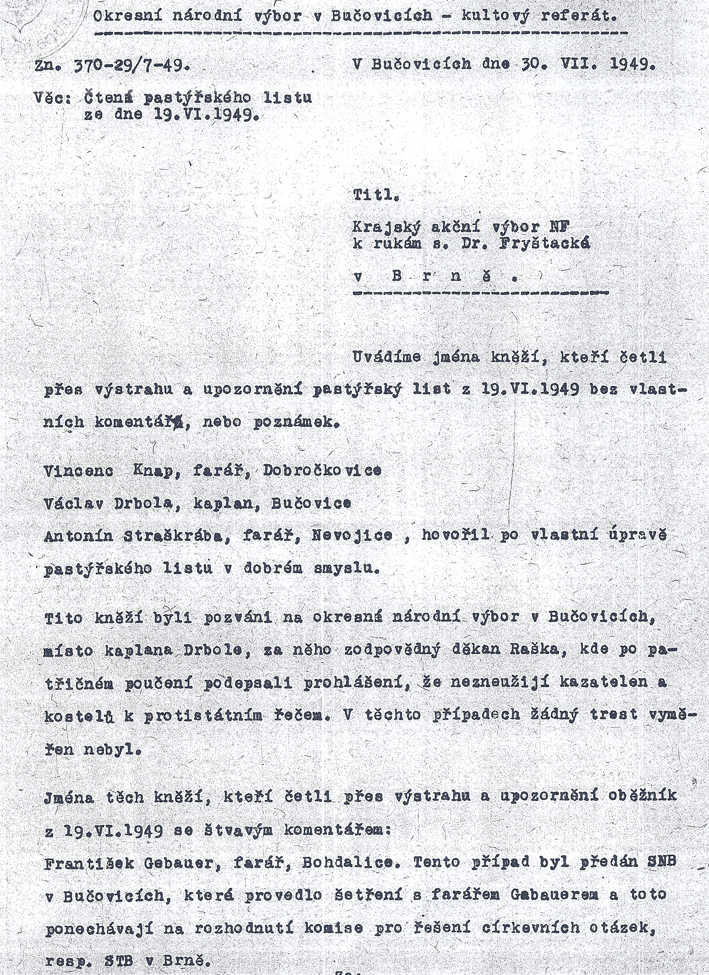 1950 V únoru 1950 je Václav Drbola přeložen na faru do Babic na Třebíčsku, kde kdysi pobýval básník Jakub Deml. Stěhuje se narychlo, protože tamní farář Arnošt Poláček je zatčen a uvězněn. Dne 25. června 1950 se na primici Miloslava Ambrože ve Velkém Meziříčí potkává Václav Drbola s knězem Janem Bulou. Netuší, že oba již brzy čeká falešné obvinění, odsouzení a smrt.
