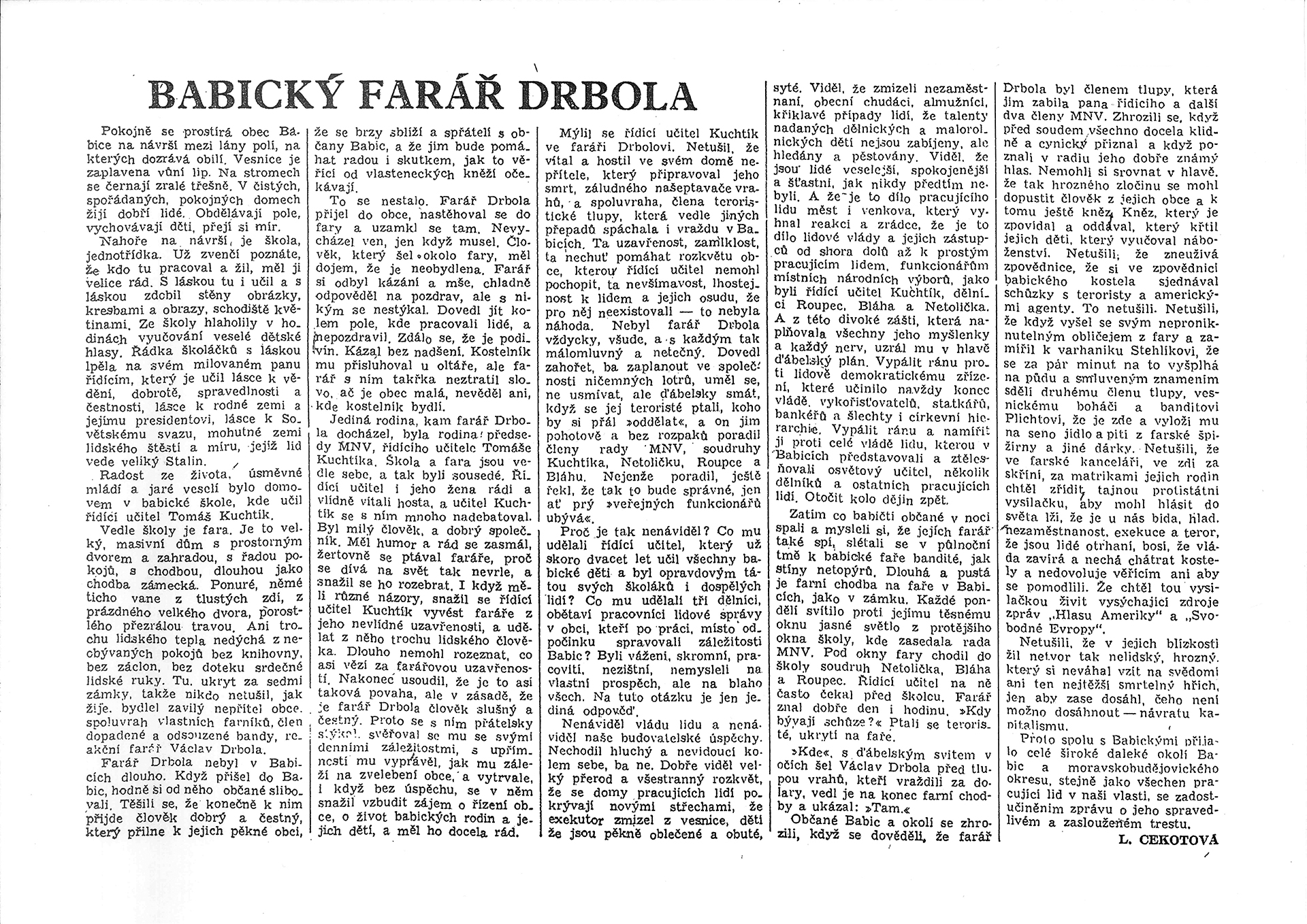 Jedním ze tří kněží, kteří se stali oběťmi justičních vražd v takzvaných babických procesech na začátku padesátých let minulého století, byl Václav Drbola. V Babicích na Třebíčsku působil jako farář od února 1950. Vystřídal Arnošta Poláčka, který byl zatčen a odsouzen v zinscenovaném procesu na dvacet let.